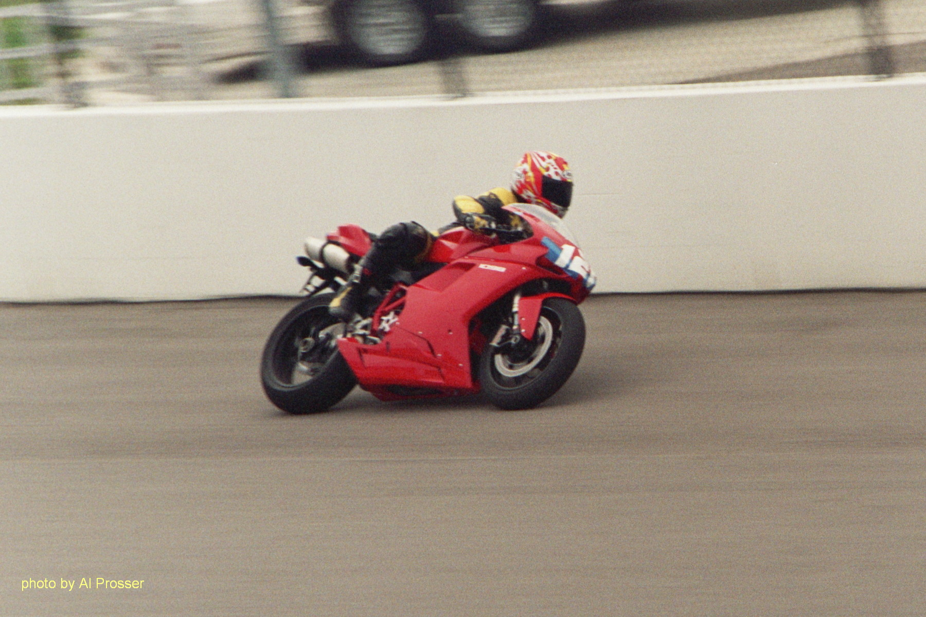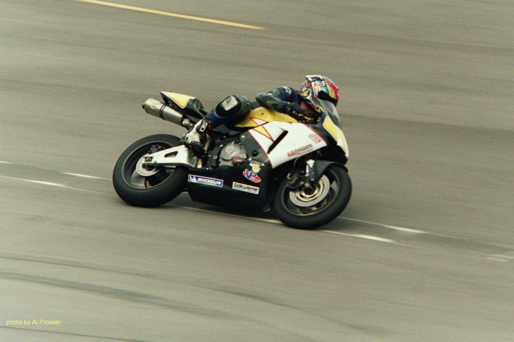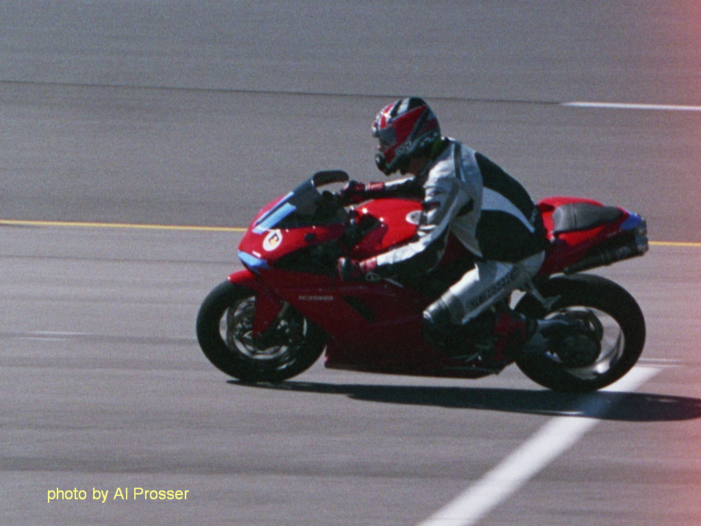 I used to take action motorcycle photos as a hobby, so took a few to share. My cameras are not exactly pro-quality and I am getting used to setting the digital for sports photos so the pictures are not as nice as I would like. I have low res copies here. Most of them have a higher resolution available if you click on them, and I have the full uncropped versions if someone is interested. Look at my Photo Notes for technical information on the photos.